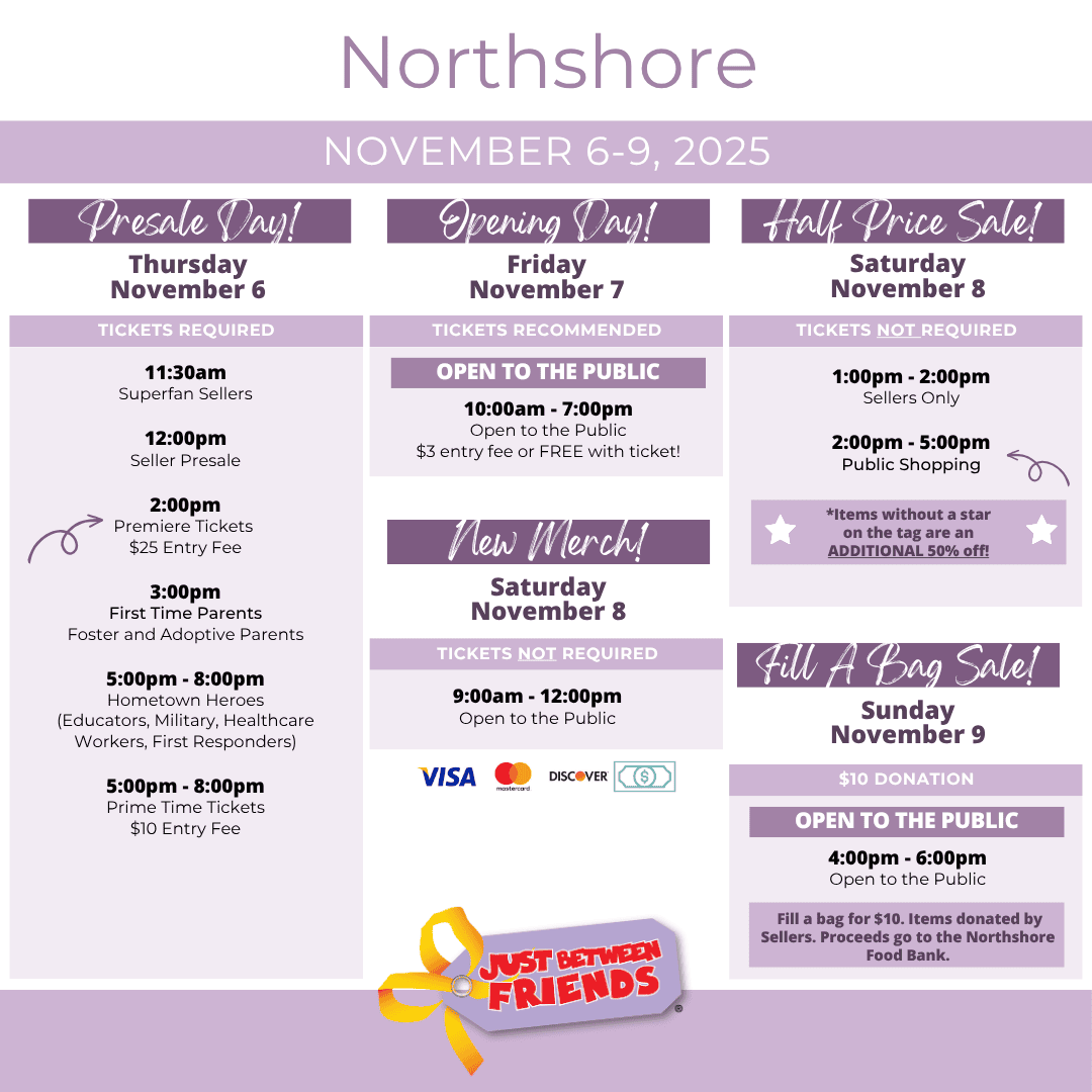 Shopping retail means hours in a mall with bored, crying kids—spending way more than you planned. And garage sales or social media buying can be disappointing and frustrating when items or connections aren't what you hoped they'd be. Shop Just Between Friends pop-up sales to save hundreds of dollars on new and gently-used clothes, toys, shoes, books and gear for all sizes—infant to teen, plus maternity—all in one place. Items are inspected for quality and safety which means great items at huge savings. You get stylish, confident, well-dressed kids while saving money and time. That's smart!